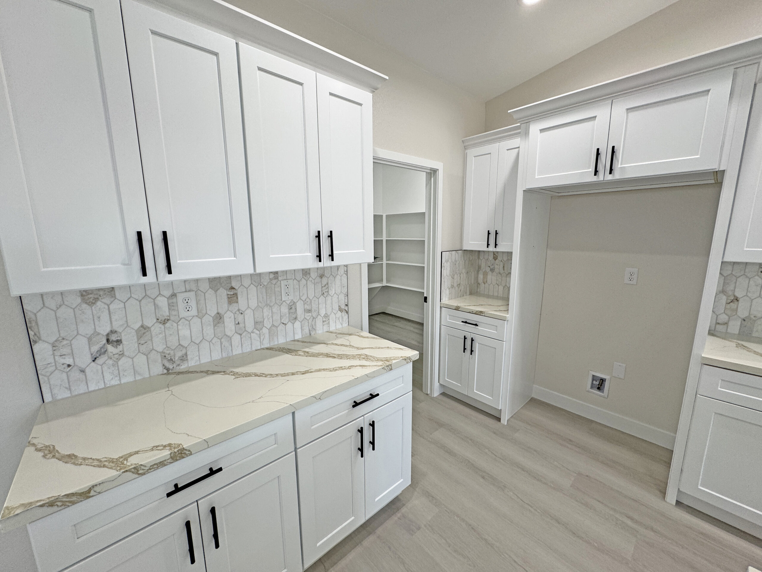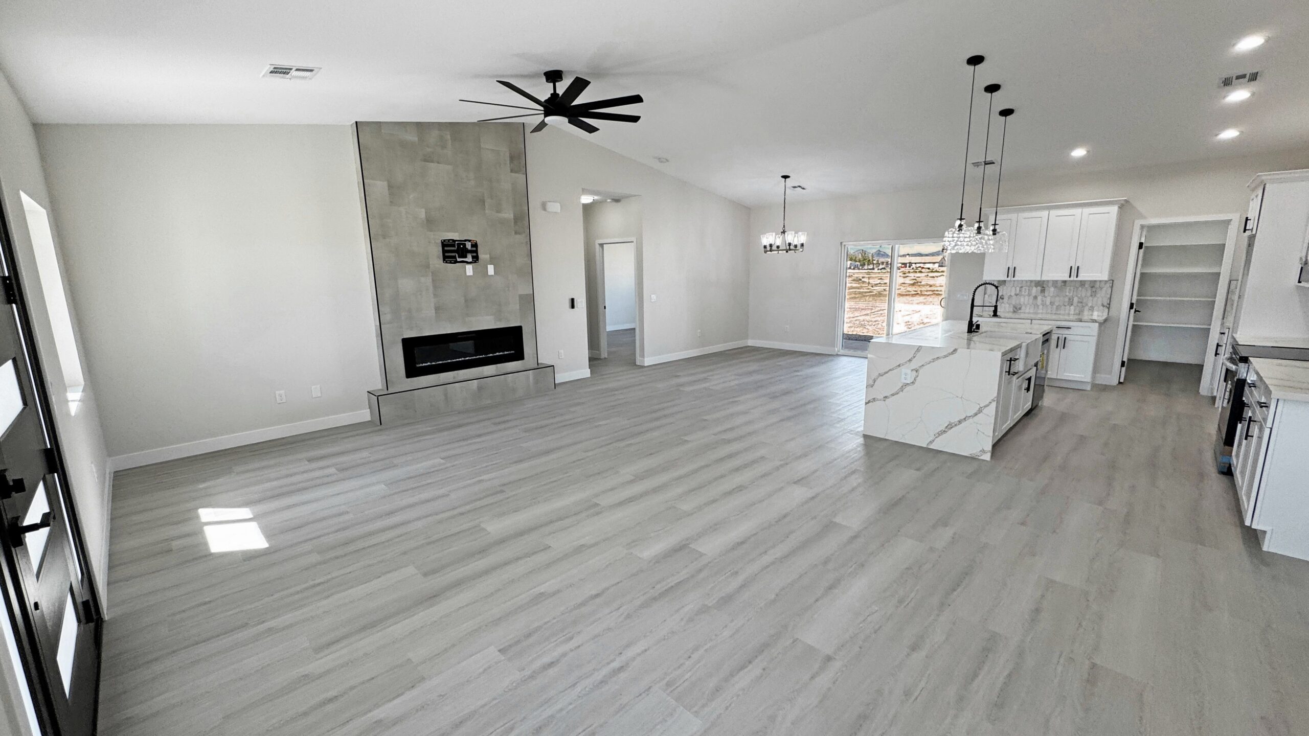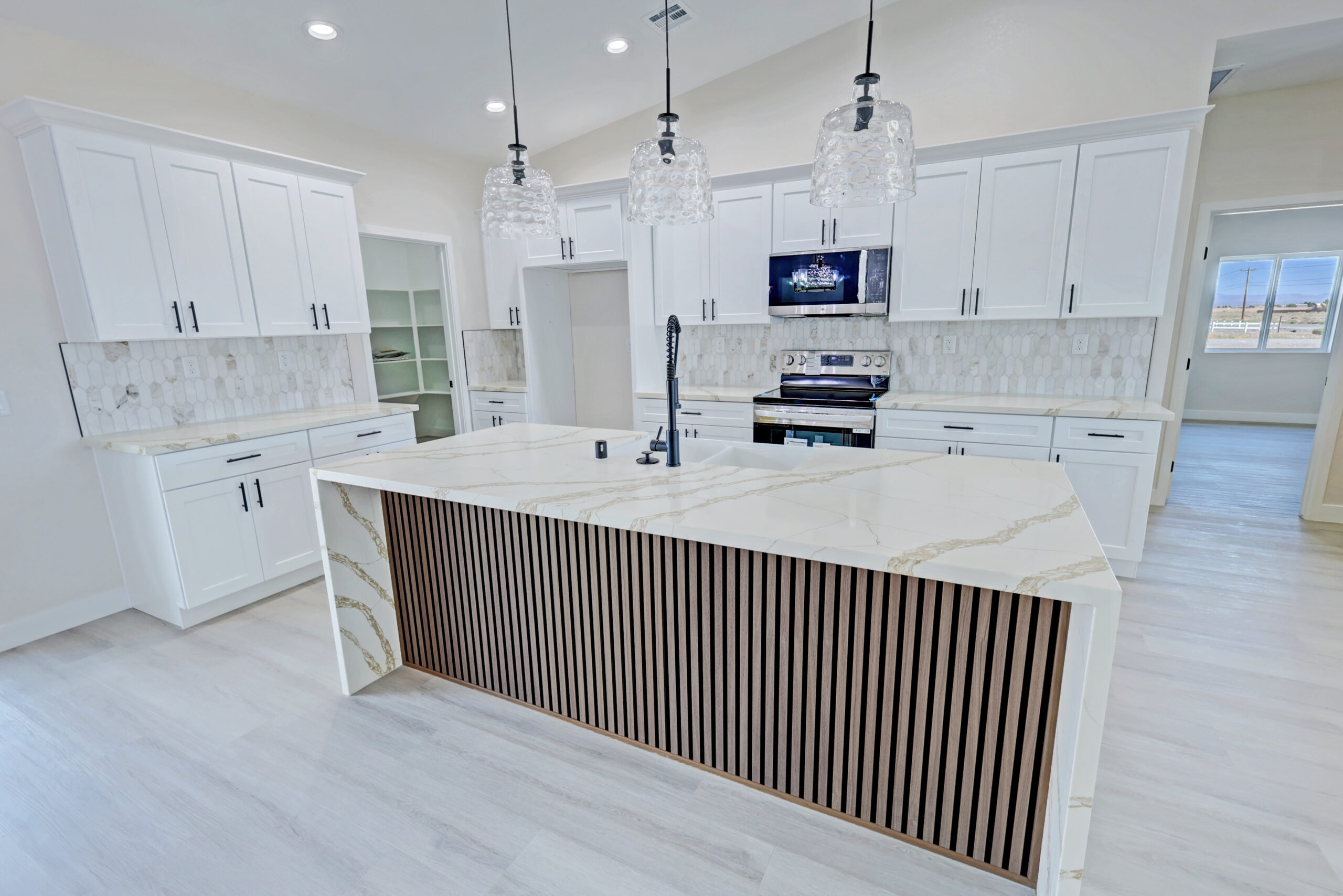 Inside, you'll find luxury vinyl plank flooring throughout the main areas, with sleek tile in the bathrooms. The heart of the kitchen is a massive quartz island —perfect for entertaining or casual meals—paired with matching quartz counters and a walk-in pantry. All bedrooms include walk-in closets and ceiling fans for year-round comfort.