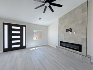 Enjoy the custom tiled electric fireplace wall in the living room, oversized covered patios front and back, low-maintenance desert landscaping, 50-amp EV charging, and full RV hookups. Decorative stonework adds serious curb appeal to complete the look.
