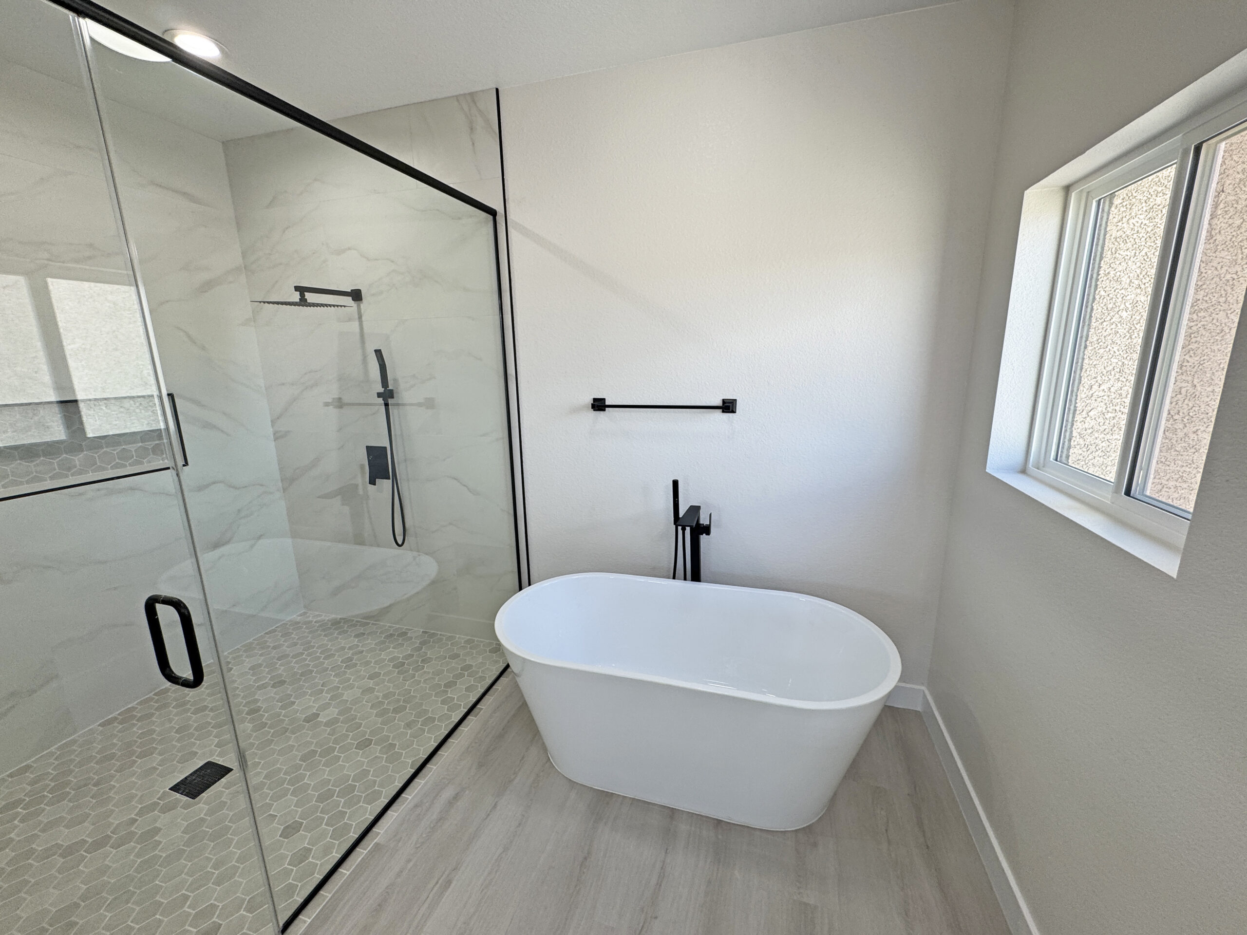 The primary suite is your own private getaway, with a spa-style walk-in shower, freestanding soaking tub, and direct access to the back patio. There’s even a second primary bedroom, ideal for guests, extended family, or a private office setup.